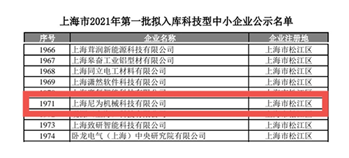 近日,根據(jù)《科技型中小企業(yè)評價(jià)辦法》,上海尼為機(jī)械科技有限公司被認(rèn)定為上海市2021年第1批擬入庫科技型中小企業(yè)。這是我司在科技創(chuàng)新型企業(yè)發(fā)展道路上取得的喜人成果,是有關(guān)部門給予我司研發(fā)和創(chuàng)新能力的認(rèn)可。